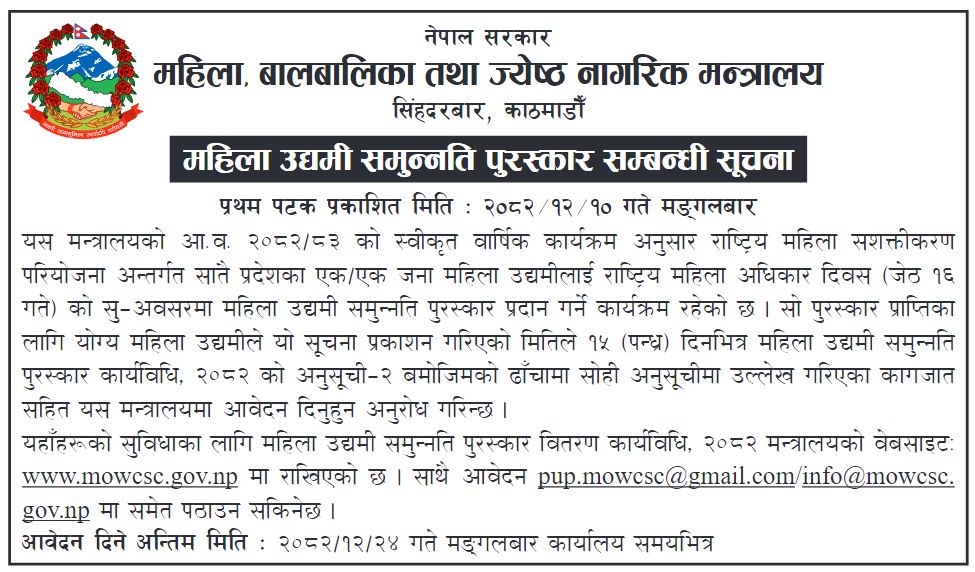 महिला उद्यमी समुन्नति पुरस्कार सम्बन्धी सूचना ।