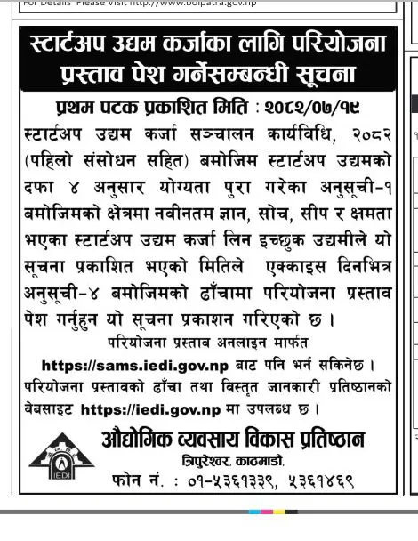 कात्तिक २४, २०८२ स्टार्टअप उद्यम कर्जाका लागि परियोजना प्रस्ताव पेश गर्ने सम्बन्त्री सूचना